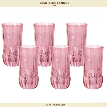 Хрустальные бокалы итальянского бренда SAME - воплощение роскоши. Каждое изделие создается на высокотехнологичном оборудовании. Декор наносится итальянскими мастерами вручную. Бокалы коллекции Adagio Rose придадут сервировке нежную элегантность. Сложные грани красиво играют при искусственном освещении..