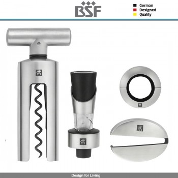 Набор винных аксессуаров Sommelier от BSF. В наборе 4 предмета: никелированный штопор, аэратор, кольцо-каплеуловитель, обрезатель фольги, . Высококачественная нержавеющая сталь. Мыть вручную...