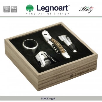 Произведено в Италии Подарочный набор винных аксессуаров - всегда востребованный подарок для ценителей напитка. В набор винных аксессуаров Legnoart входит нож-сомелье, каплеуловитель, дозатор для аккуратной подачи и пробка для хранения вина. Изделия изготовлены из высококачественных материалов: нержавеющей стали, дерева, ..