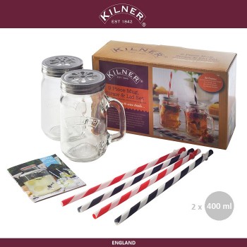 Легендарные кружки Drink Jar от KILNER для стильной и оригинальной подачи любых прохладительных напитков и десертов. В подарочный набор входит: 2 кружки, объемом 400 мл + 2 крышки с отверстиями + 2 трубочки + рецепты. Идеально подходят для лимонадов, коктейлей, шейков, воздушных десертов, айс-кофе, айс-ти и многого д..