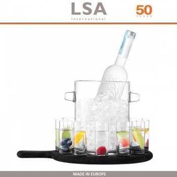 Сет из стопок, ведёрка для льда и деревянной подставки из натурального дуба была создана дизайнерами LSA International под впечатлением от тирольских горных баров, где домашний шнапс принято предлагать в шотах на деревянной подставке, передавая её от одного гостя другому. Это добавляет непринужденности и веселья любому застоль..