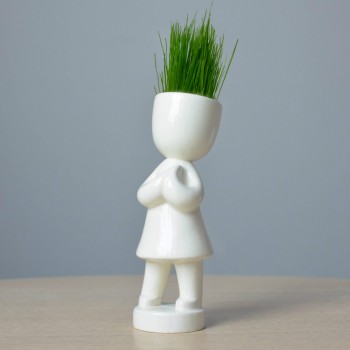 Замечательный набор «Милашка» позволяет без особых усилий вырастить зеленую травку прямо на подоконнике. В комплекте с фигуркой идет пакетик с грунтом, семена и инструкция для посадки. Траву можно подстригать, создавая модную прическу для очаровательной девочки. Изделие сделано вручную из качественной керамики. На поверхности можно писать и рисо..