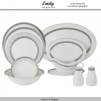 Коллекция Veronika (Вероника) - изысканное сочетание современной формы и нежного классического декора серебристых тонов. В наборе 19 предметов на 6 персон: 6 х обеденных тарелок (27 см), 6 х закусочных тарелок (20 см), 6 х глубоких тарелок-салатников (15 см), 1 х салатник (23 см). Посуда Emily производится из высококачественного костяно..
