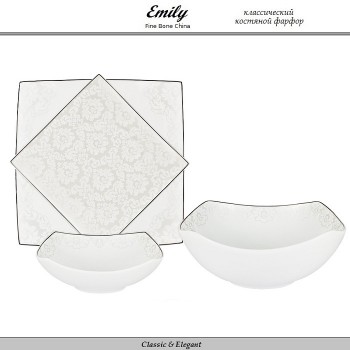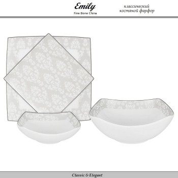 Коллекция Paris (Париж) - элегантная классика в современной интерпретации. В наборе 19 предметов на 6 персон: 6 х обеденных тарелок (27 см), 6 х закусочных тарелок (20 см), 6 х глубоких тарелок-салатников (15 см), 1 х салатник (23 см). Посуда Emily производится из высококачественного костяного фарфора. Поверхность изделий пок..