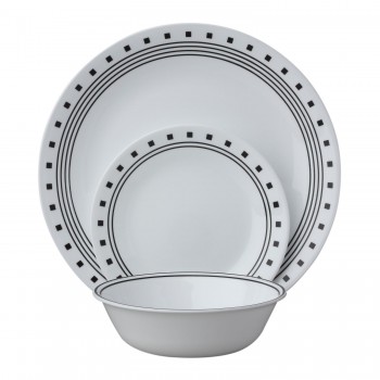 Произведено в США. В наборе 12 предметов на 4 персоны: 4 обеденные тарелки - размер 25 см, 4 закусочные тарелки - размер 18 см 4 миски - объем 650 мл Серия "City Block" неизменно остается в составе коллекций посуды Corelle и является абсолютным бестселлером компании на протяжении нескольких лет..
