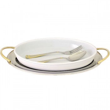 Блюдо овальное с фарфоровой вставкой с ложкой и вилкой Era, L 39 см, W 26 см, позолота, Giorinox