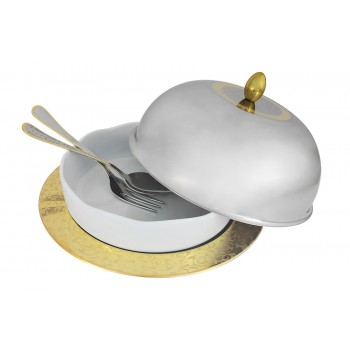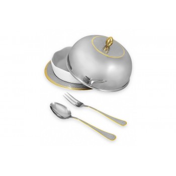 Блюдо с крышкой с фарфоровой вставкой с ложкой и вилкой Nain, D 14 см, посеребрение, позолота, Giorinox