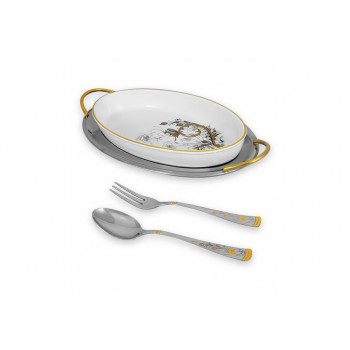 Набор для горячего из 2-х фарфоровых блюд на подносе с ложкой и вилкой Arabesco, фарфор, позолота, Giorinox