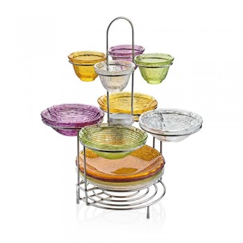 В набор входят: металлическая подставка, высотой 48 см 4 салатника, диаметром 9 см 4 салатника, диаметром 16 см 4 блюда, диаметром 22 см цвета: прозрачный, зеленый, аметист, янтарь ..