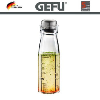 Бутылка MIXO от немецкого бренда GEFU предназначена для приготовления салатных заправок и соусов. На внешней стороне бутылки нанесено 5 рецептов с мерными делениями для самых популярных салатных заправок. Изготовлена из пищевого пластика (акрила). Пробка из нержавеющей стали. Дизайн пробки изменился. Рекомендуется мыть вручн..