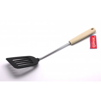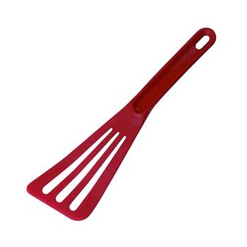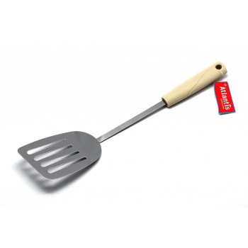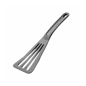 Лопатка классического дизайна с пластиковой рабочей частью снабжена широкими продольными прорезями. Через них легко удаляются излишки жира или масла при готовке пищи в сковороде или фритюрнице. Металлический стержень ручки изогнут – это дает возможность передвигать и переворачивать пищу даже в глубоких сковородах. Такие лопатки также используются ..
