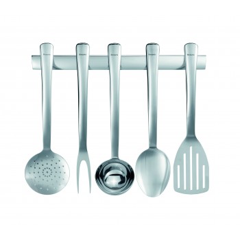 Стильный комплект кухонных принадлежностей изготовлен из высококачественной нержавеющей стали, благодаря чему прослужит Вам долгое время! •В комплект входят: шумовка, вилка для мяса, половник, ложка для гарнира, кулинарная лопатка и настенная планка с системой скрытых креплений. •Планка легко и надежно крепится к стене с помощью системы скрытых к..