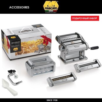 Комплект для приготовления домашней пасты Multiplast 150 от Marcato включает лапшерезку Atlas 150 с классической двойной насадкой и 3 дополнительные насадки. Позволяет приготовить 6 различных видов домашней итальянской пасты: лазанью (lasagne), фетучини (fettuccine, 6 mm), тальолини (tagliolini, 1,5 мм), реджинет..