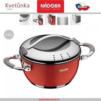 KVETUNKA Кастрюля, индукционное дно, D 16 см, 1.4 л, нержавеющая сталь 18/10, цвет красный, Nadoba, Чехия