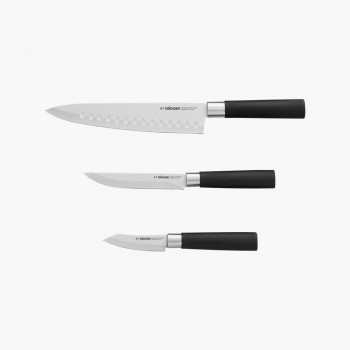 Кухонные ножи серии Dana изготовлены из высококачественной нержавеющей стали премиум-класса, лезвия ножей остаются острыми очень долгое время. Ручки ножей выполнены из кованой нержавеющей стали и прочного водостойкого древесно-полимерного композита Pakkawood. Блок набора ножей, входящего в серию, изготовлен из натурального благородного дерева (ясен..