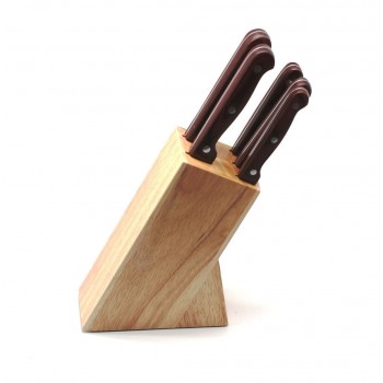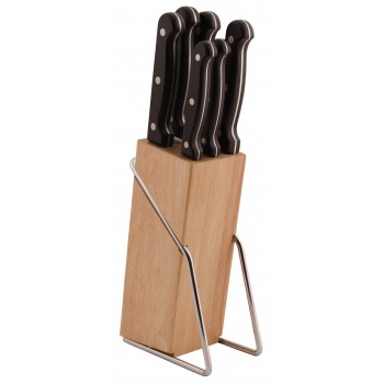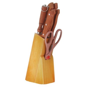 ОписаниеВ этой стильной деревянной подставке для ножей собраны 6 кухонных принадлежностей первой необходимости: острый фруктовый нож, универсальный нож, разделочный нож, нож для хлеба, поварской нож и ножницы для разделки птицы. Каждый предмет снабжен лезвием из высококачественной нержавеющей стали и устойчивой к растрескиванию деревянной ручкой, ..