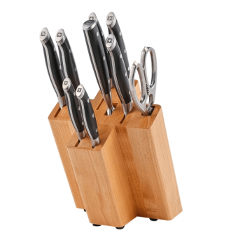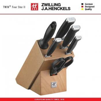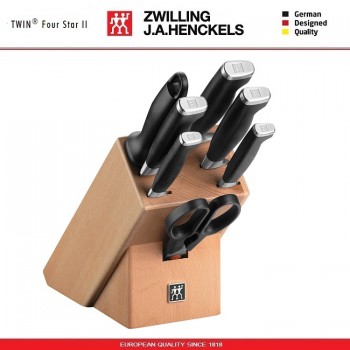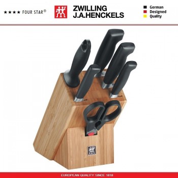 В набор ножей серии Four Star от Zwilling из 7-ти предметов входит: нож для овощей и фруктов, лезвие 10 см нож универсальный, серрейторное лезвие 13 см нож для нарезки, лезвие 16 см поварской нож, лезвие 20 см нож для хлеба, серрейторное лезвие 20 см ножницы кухонные блок-подставк..