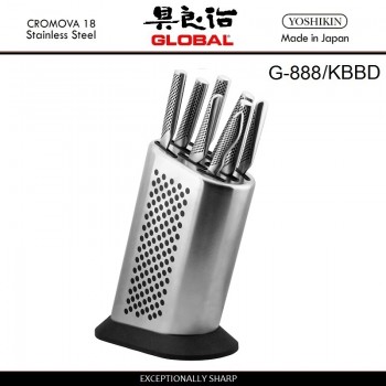 В набор кухонных ножей Global G-888KBBD входит 8 предметов на подставке: поварской нож G-2, длина лезвия 20 см мясной нож G-3, длина лезвия 21 см топорик для шинковки овощей G-5, длина лезвия 18 см хлебный нож G-9, длина лезвия 22 см обвалочный нож G-21, длина лезвия 16 см универсальный нож GS-1, д..