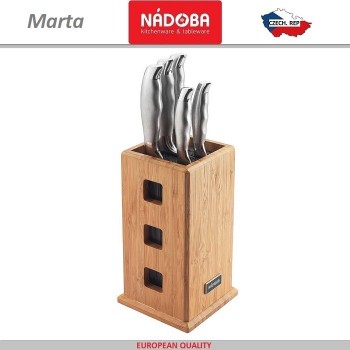 Произведено в Чешской Республике - Ножи серии Marta изготовлены из высококачественной нержавеющей стали премиум класса, лезвия ножей остаются острыми очень долгое время. - Ручки ножей выполнены из кованой нержавеющей стали с уникальной противоскользящей поверхностью. - Универсальный блок набора ножей изготовлен из натурального дерева (ба..