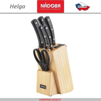 Произведено в Чешской Республике - Ножи серии Helga изготовлены из высококачественной нержавеющей стали, их лезвия остаются острыми долгое время. - Эргономичные ручки ножей выполнены из бакелитовых накладок с креплениями из нержавеющей стали. - Блок набора ножей, входящего в серию, изготовлен из натурального дерева (сосна) и оснащён встр..