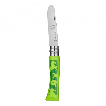 Нож из коллекции My First Opinel с лезвиями 8 см из нержавеющей стали и яркими нескользящими рукоятками. Рукоятка украшена рисунками животных...