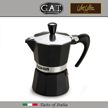 Италия Современная итальянская гейзерная кофеварка G.A.T. модель BLACK STAR. Подходит для газовых, электрических, стеклокерамических плит, кроме индукционных. Изготовлена из пищевого алюминия. Ручка выполнена из жаропрочного бакелита, не нагревается в процессе приготовления, защищая от ожогов. ..