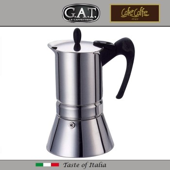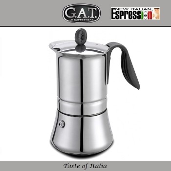 Италия Современная итальянская гейзерная кофеварка G.A.T. модель VIP INOX. Подходит для любых плит, включая индукционные. Изготовлена из нержавеющей стали, снаружи зеркальная полировка. Ручка выполнена из жаропрочного бакелита, не нагревается в процессе приготовления, защищая от ожогов. Внутренняя ча..