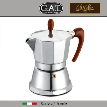 Италия Классическая итальянская гейзерная кофеварка G.A.T. модель MAGNIFICA. Подходит для любых плит, кроме индукционных. Изготовлена из пищевого алюминия. Ручка выполнена из натурального дерева цвета орех, не нагревается в процессе приготовления, защищая от ожогов. Внутренняя часть нижней кам..