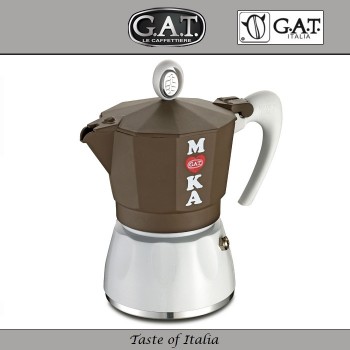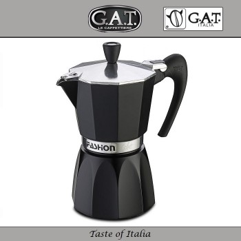 Италия Современная итальянская гейзерная кофеварка G.A.T. модель FASHION. Общий объем рассчитывается исходя из принятого объема чашки эспрессо - 50 мл. Подходит для индукционных, газовых, электрических, стеклокерамических плит. Изготовлена из пищевого алюминия, рекомендованного для контакта с пищевыми прод..