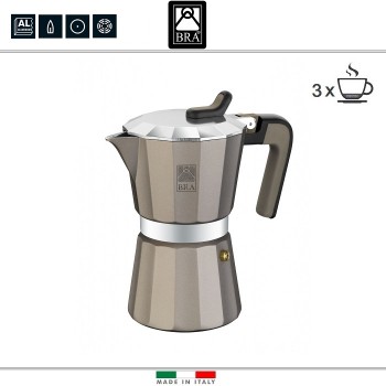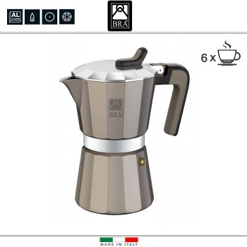 Гейзерные кофеварки BRA серии Titanuim подходят для использования на газовых, электрических и стеклокерамических плитах. Произведены на заводе в Италии. Корпус изготовлен из шлифованного пищевого алюминия высокого качества. Внешнее антипригарное покрытие делает очистку максимально быстрой и легкой и с..