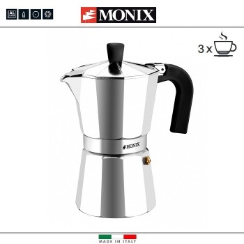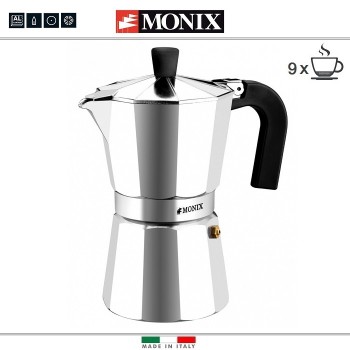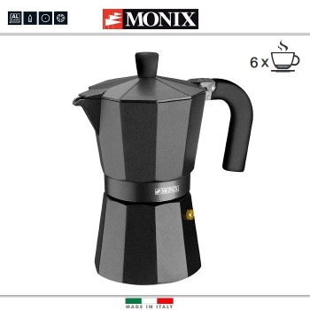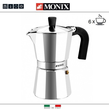 Гейзерные кофеварки известной итальянской фирмы Monix серии Express подходят для использования на газовых, электрических и стеклокерамических плитах. Производятся на заводе в Италии. Изготовлены из шлифованного пищевого алюминия высокого качества. Ручки изготовлены из жаропрочного бакелита. Мыть вруч..