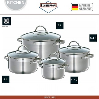 Kuchenprofi - известный немецкий производитель профессиональных кухонных инструментов, утвари и полезных приспособлений, которые делают процесс приготовления различных блюд простым и приятным. В набор кастрюль SAN REMO входят 4 кастрюли с 4 крышками: 1.2 литра (16 х 8.5 см), 2.5 литра (20 х 9.5 см), 3 литра (20 х 11.5 см),..