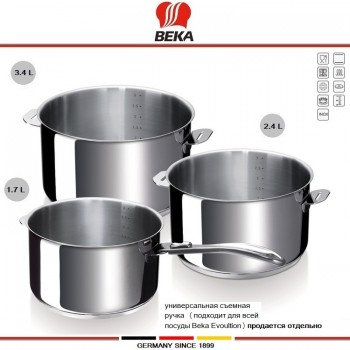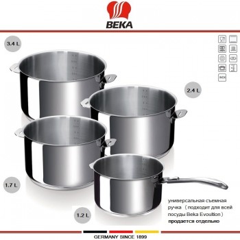 Посуда премиум-класса от немецкой фирмы BEKA - надежная репутация, высокое качество, дизайн и продуманность. В наборе 4 предмета: кастрюля 3.4 литра (20 см), кастрюля (ковшик) 2.4 литра (18 см), кастрюля (ковшик) 1.7 литра (16 см), кастрюля (ковшик) 1.2 литра (14 см). Коллекция Beka EVOLUTION - современная посуда-конструктор..