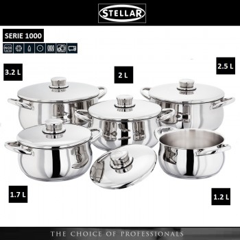 Набор кастрюль STELLAR 1000, 5 шт, 1.3 / 1.7 / 2 / 2.5 / 3.2 литра, сталь 18/10, STELLAR