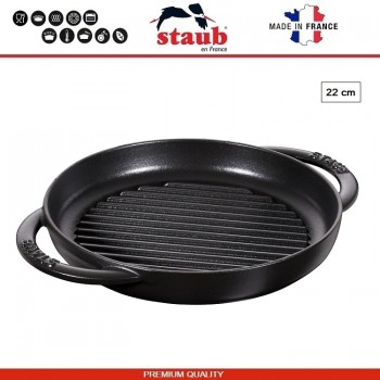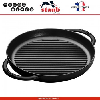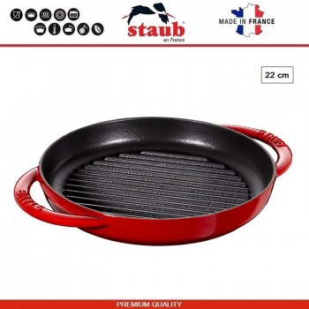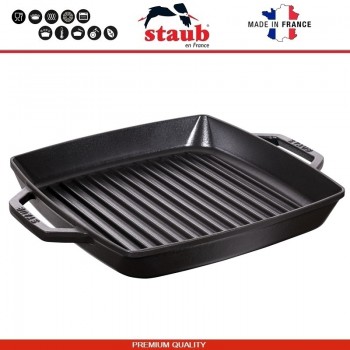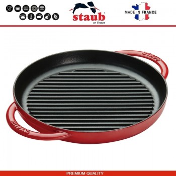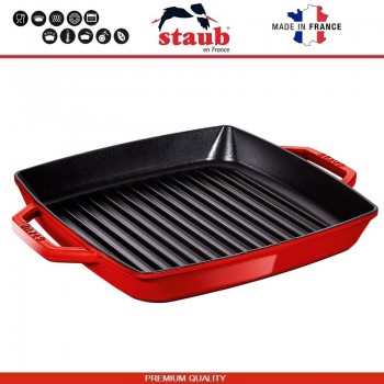 Чугунная посуда Staub производится во Франции. Подходит для всех типов плит, включая индукционные. Подходит для духовки. Рекомендована легендарным мишленовским поваром Полем Бокюзом (Paul Bocuse) и другими известными поварами. Серия GRILL - это сковороды с выпуклыми продольными полосами, придающими мясу или овощам характерный рису..