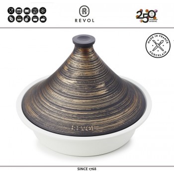 Произведено во Франции Тажины известной французской фирмы REVOL - подлинный образец высокого качества и стильного дизайна. Новое поколение тажинов REVOL REVOLUTION максимально функционально - подходит для духовки, индукционных, газовых, электрических и стеклокерамических плит. Нижнее блюдо может использоваться отдель..