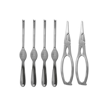Набор инструментов для разделки и подачи морепродуктов, изготовленный из высококачественной нержавеющей стали. В комплект входит: вилки (4 шт.) и пассатижи (2 шт.). Можно мыть в посудомоечной машине...