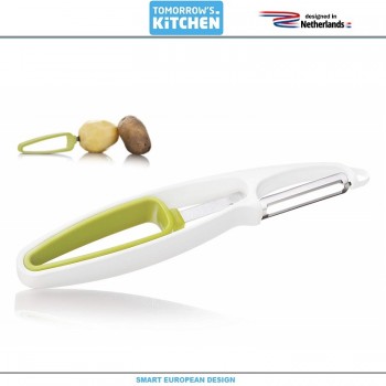 Овощечистка Tomorrow's Kitchen состоит из держателя и ножа для чистки. Держатель нужно воткнуть в овощ или фрукт, а нож для чистки легко счистит с него шкурку. За счет использования держателя, чистка становится быстрее и безопаснее. Для хранения две части можно сложить вместе. На ноже есть специальный крючок для удаления небольших дефектов, наприме..
