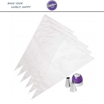 Американская компания Wilton более 90 лет занимается производством посуды и аксессуаров для домашней выпечки. Кондитерский набор для декорирования выпечки включает одноразовые мешки, адаптер для насадок и насадки для декорирования. ..